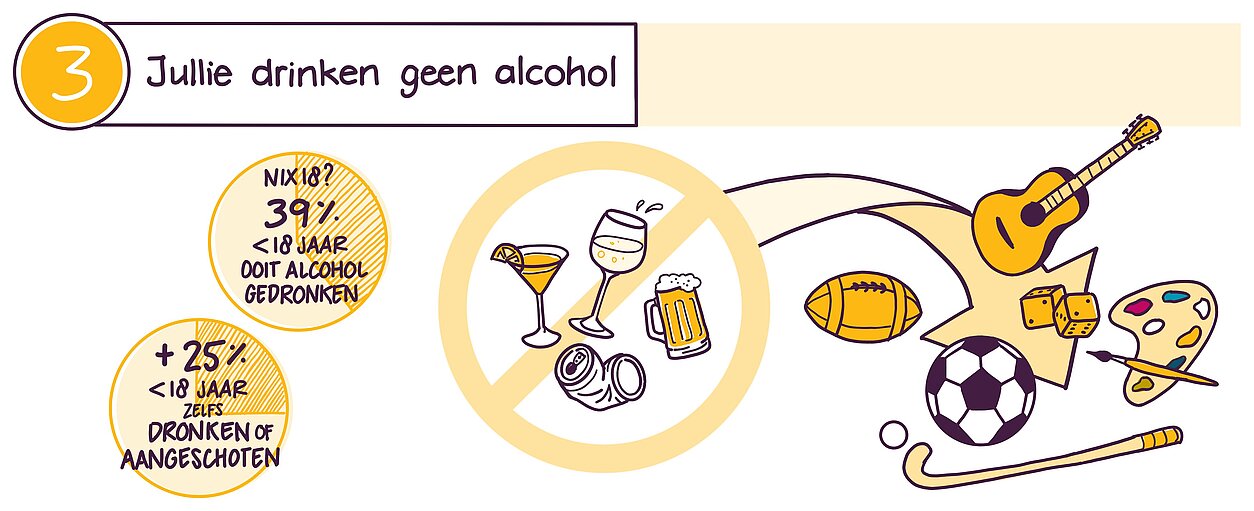 Het plaatje 'Jullie drinken geen alcohol' gaat over verminderen van alcoholgebruik onder jongeren. In het midden van het plaatje staat een grote pijl die van links naar rechts beweegt. Aan het begin van de pijl staan verschillende soorten alcohol. Deze staan in een rond bord met streep erdoorheen (stopbord). Aan het eind van de pijl staan alternatieven: rugbybal, gitaar, voetbal, hockeystick, dobbelstenen, verfpalet. Er zijn ook 2 cirkels met daarin: