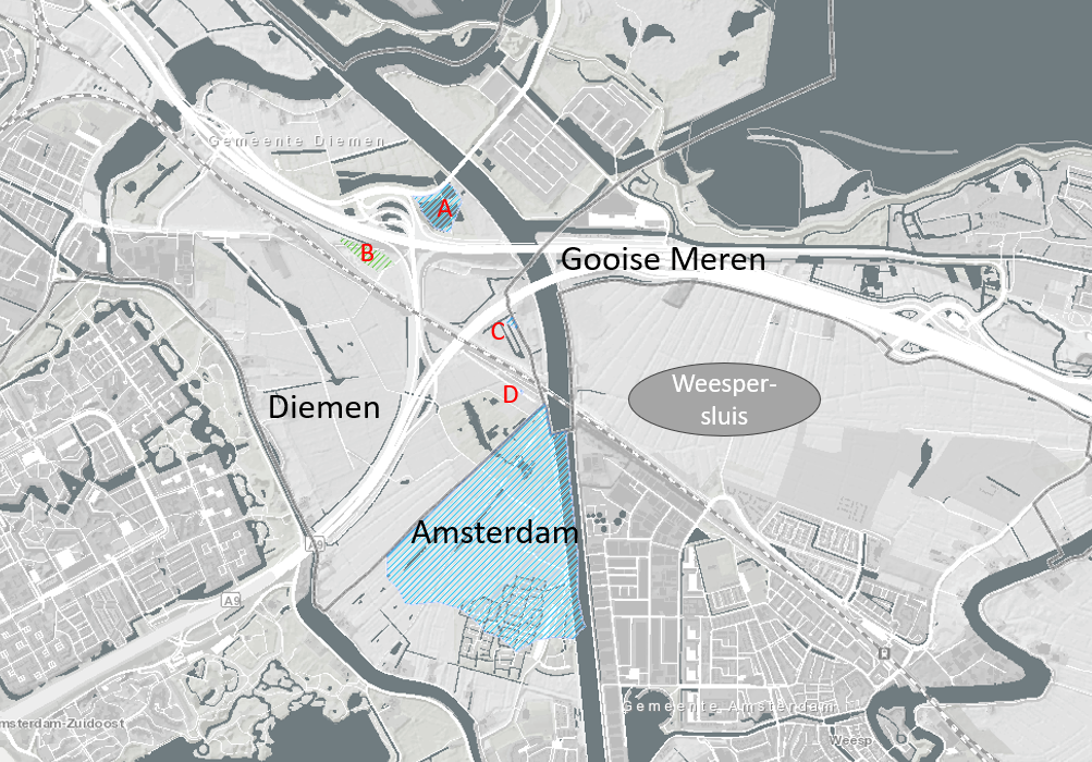 Bekijk de zoekgebieden voor windenergie op de kaart (PNG, 1 MB). De gebieden A, B, C, D zijn de projectgebieden voor windenergie van Diemen. Het blauw gestreepte gebied in Amsterdam is het zoekgebied Amsterdam-Diemerscheg. 1 van deze zoeklocaties, zoekgebied C, ligt vlakbij de gemeentegrens van Gooise Meren.